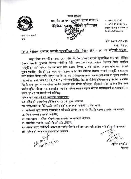 वैदेशिक रोजगार सन्तती छात्रवृत्तिका लागि निवेदन दिने म्याद थप गरिएको सूचना ।