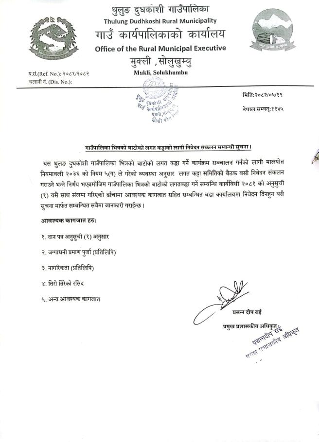 गाउँपालिका भित्रको बाटोको लगत कट्टाको लागि निवेदन संकलन सम्बन्धी सूचना।