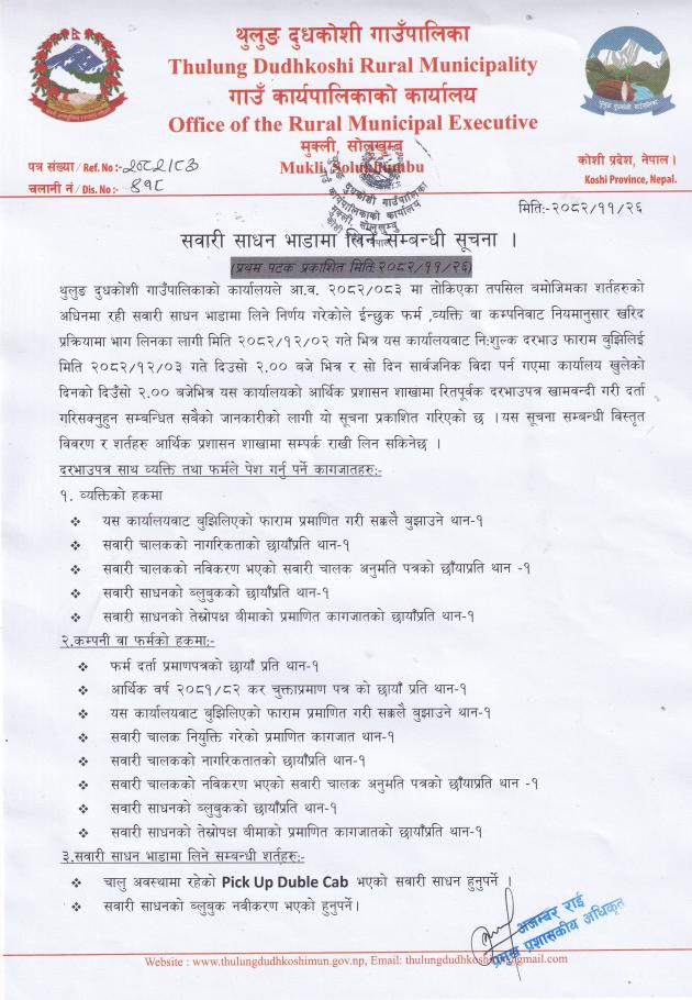 सवारी साधन भाडामा लिने सम्बन्धी जरुरी सूचना ।